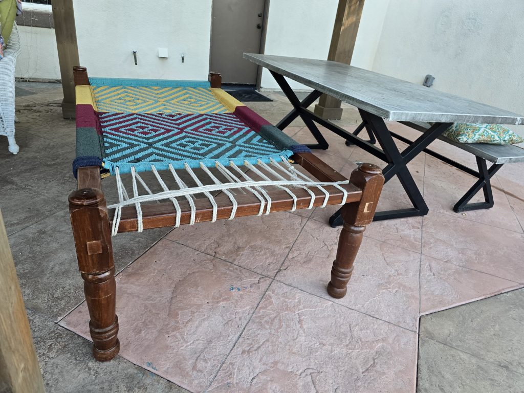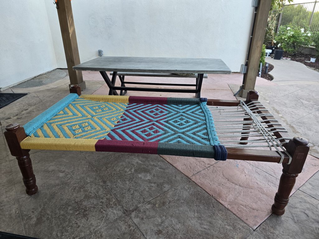 Each charpai is handcrafted. 3/4th weave plus stretching web to keep the wean tight. As cotton stretches over the years you can tighten the weave with a single rope like a shoe-lace.